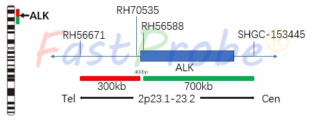 ALK基因5’端标记为绿色,长度为700kb; ALK基因3’端标记为橘红色,长度为300kb。