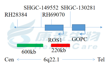 ROS1基因5’端标记为橘红色,长度为220kb; ROS1基因3’端标记为绿色,长度为600kb。