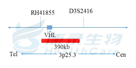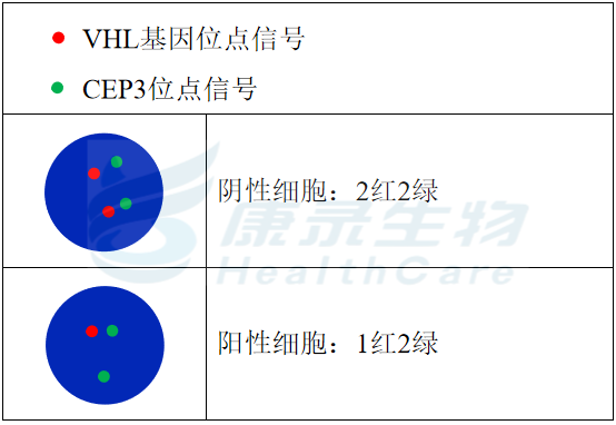VHL基因(3p25.3)标记为橘红色; 3号染色体着丝粒(CEP3)标记为绿色。
