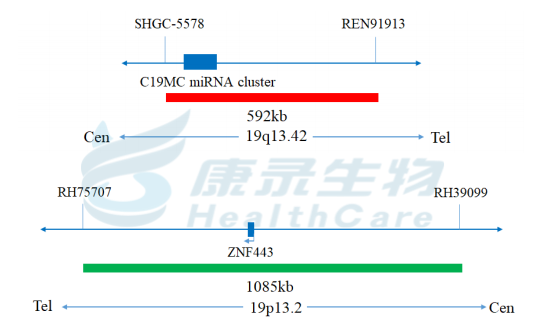 C19MC基因(19q13.42)标记为橘红色; 19p13.2段标记为绿色。
