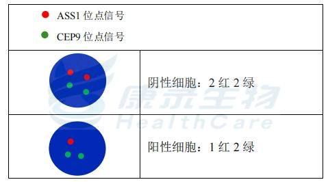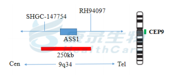 ASS基因(9q34)标记为橘红色; 9号染色体着丝粒(CEP9)标记为绿色。