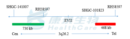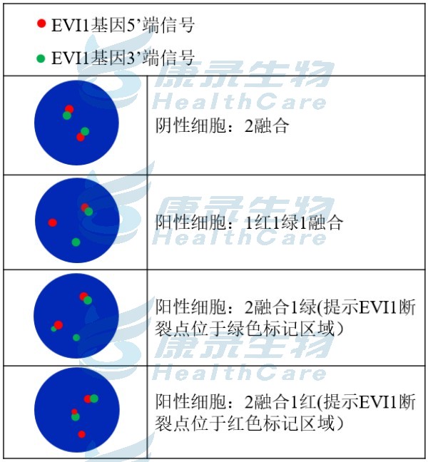 EVI1基因近端粒端标记为橘红色; EVI1基因近着丝粒端标记为绿色。