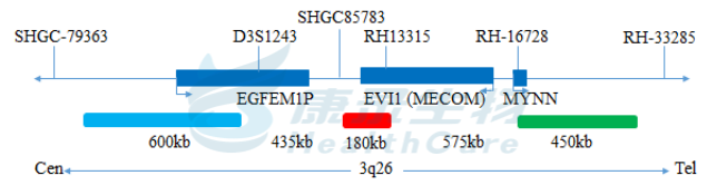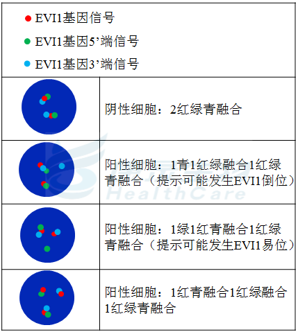 EVI1基因5' 端标记为绿色; EVI1基因3' 端近端粒端标记为橘红色; EVI1基因3' 端近着丝粒端标记为青色。