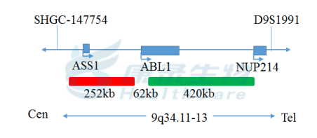 ABL1基因5’端标记为橘红色; ABL1基因3’端标记为绿色。
