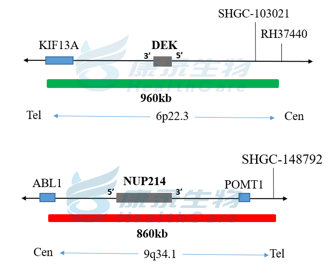 NUP214基因标记为橘红色,总长度为860kb; DEK基因标记为绿色,长度为960kb。