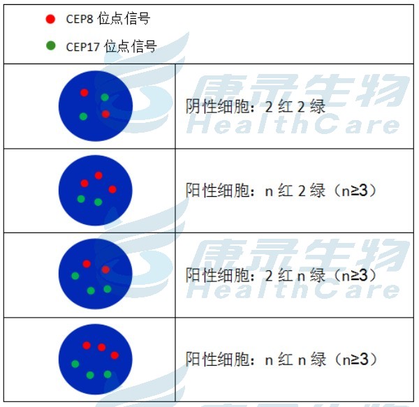 CEP8橘红色探针;CEP17绿色探针。CEP17橘红色探针。CEP17绿色探针。CEP17青色探针。