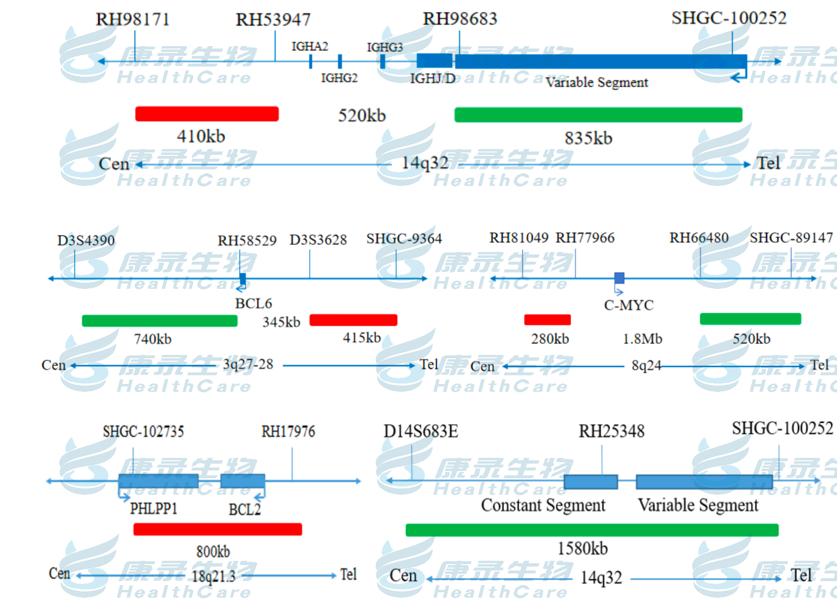 MYC基因断裂和BCL2基因断裂或BCL6基因断裂可用于双重打击淋巴瘤(DHL)的诊断。