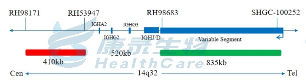 IGH基因近着丝粒端标记为橘红色; IGH基因近端粒端标记为绿色。