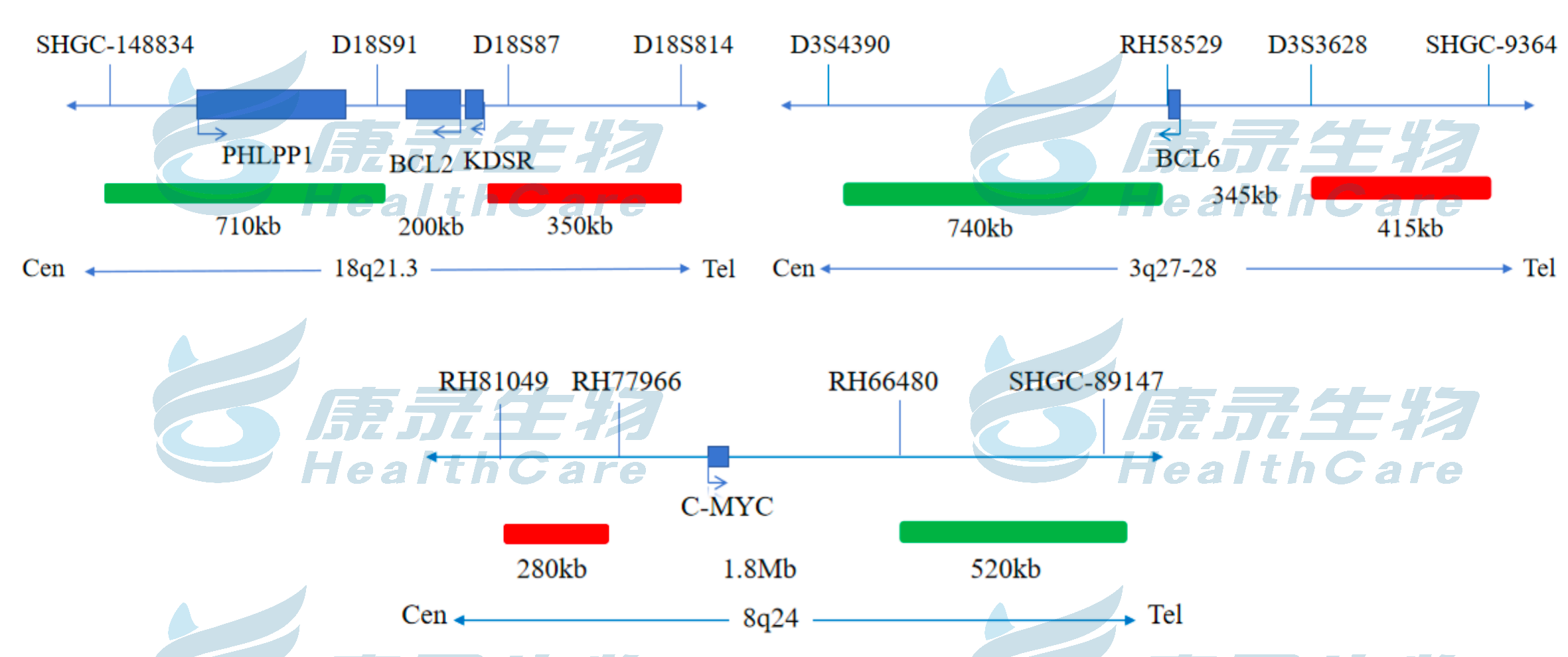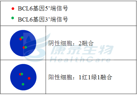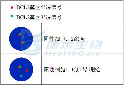 MYC基因5’端标记为橘红色; MYC基因3’端标记为绿色。 BCL6基因5’端标记为橘红色; BCL6基因3’端标记为绿色。 BCL2基因5’端标记为橘红色; BCL2基因3’端标记为绿色。