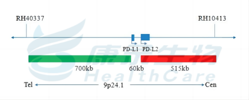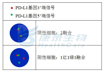 PD-L1基因3’端标记为橘红色; PD-L1基因5’端标记为绿色。