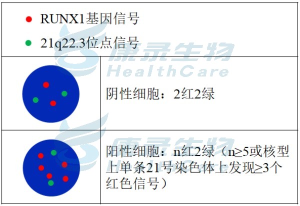 RUNX1橘红色探针;21q22.3绿色探针。
