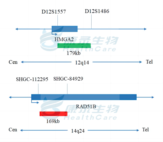 RAD51B基因橘红色探针;HMGA2基因绿色探针。