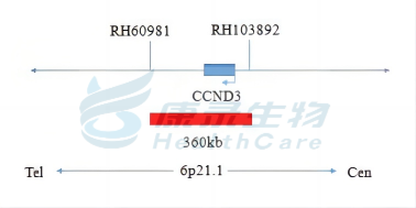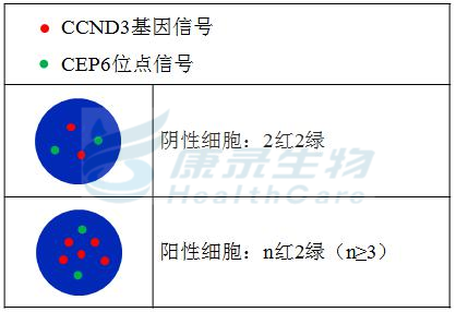 CCND3基因橘红色探针;CEP6绿色探针。