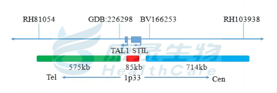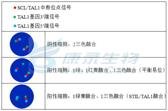 TAL1基因5' 端标记为青色; TAL1基因3' 端近端粒端标记为绿色; TAL1基因3' 端近着丝粒端标记为橘红色。