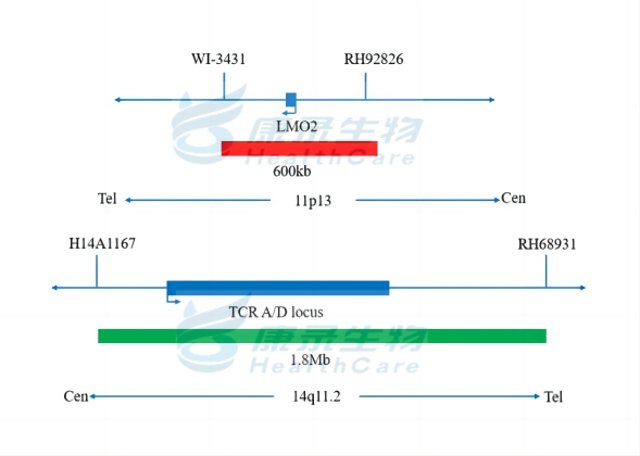 辅助诊断LMO1::TRAD融合的T-ALL; T细胞急性淋巴细胞白血病(T-ALL)是一种未成熟的淋巴样肿瘤,可发生于骨髓、纵隔、中枢神经系统和淋巴样器官。它们占儿科病例的10-15%和成人急性淋巴细胞白血病(ALL)病例的25%左右,这是一种广泛的异质性疾病,由多种遗传异常共同发生引起,这些异常随着时间的推移而获得,一旦积累,就会导致全面的白血病。 亚型之一的TAL/LMO T-ALL在成人占比为12%,在儿童占比为32%,这类特点是碱性螺旋-环-螺旋(bHLH)转录因子家族成员(TAL1和TAL2)和/或LIM-only结构域(LMO1、LMO2和LMO3)基因的重排,LMO1基因(11p15)与T细胞受体α/δ基因发生并置,导致前者调控失常而高表达。