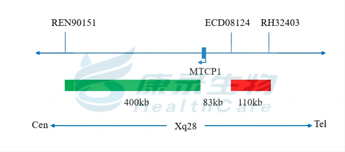 MTCP1基因5'端标记为橘红色; MTCP1基因3'端标记为绿色。