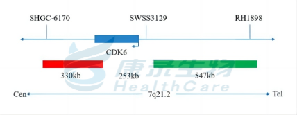 CDK6基因3'端标记为橘红色; CDK6基因5'端标记为绿色。