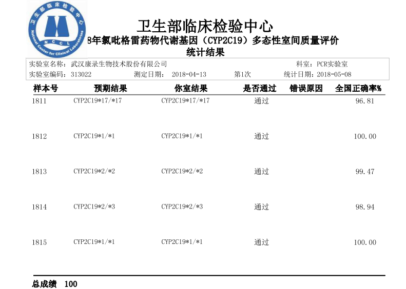 卫生部临床检验中心(NCCL)自1982年成立以来,承担卫生部委托的全国临床检验质量管理与控制工作,运行全国临床检验室间质量评价计划,室间质量评价是临床实验室保证和改进检验质量的重要手段,也是医疗机构临床实验室行政管理和实验室认可的基本要求。此次全满分通过卫计委临检中心的2项室间质评,彰显了william威廉英国官网的领先技术实力和质量管理水平。