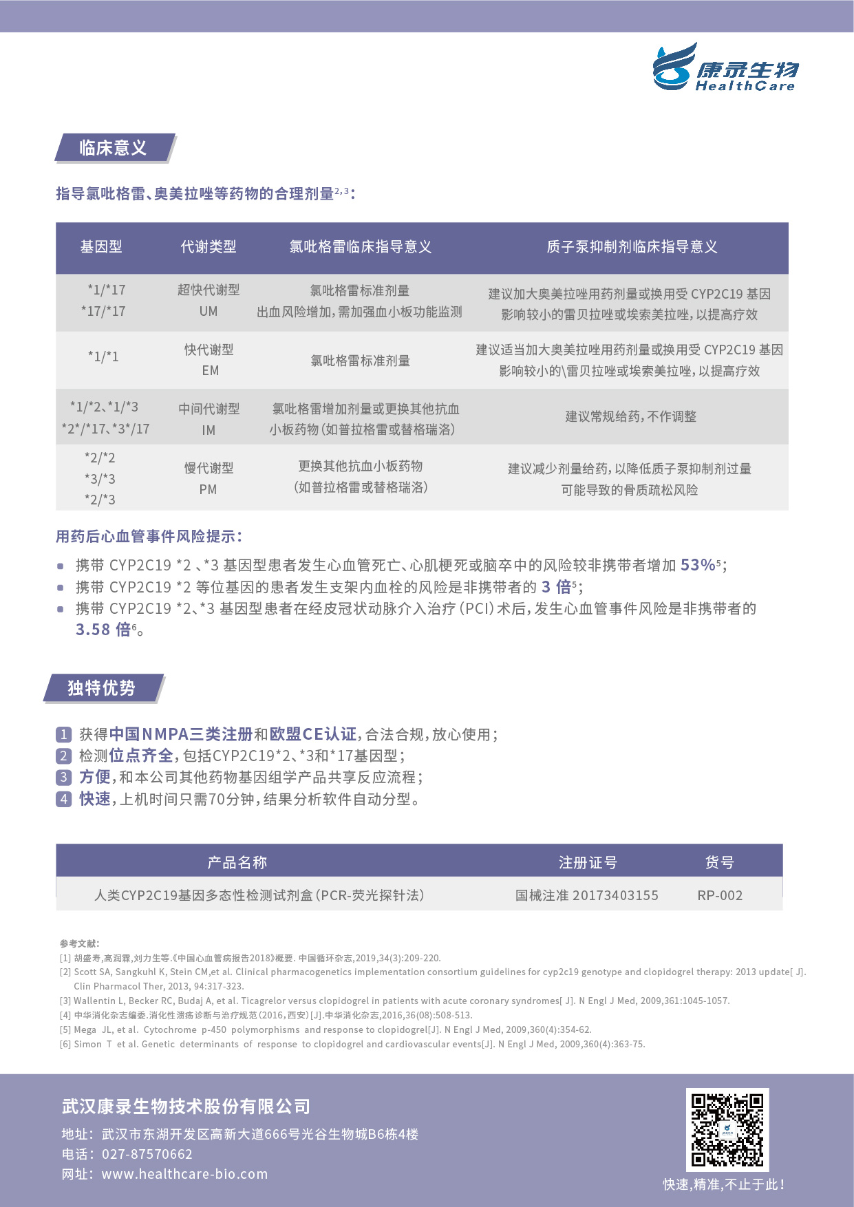 氯吡格雷:CYP2C19基因型与冠心病和缺血性卒中患者的预后具有显著相关性。多项回顾性研究均提示,在服用氯吡格雷的冠心病患者中,携带CYP2C19功能缺失等位基因者与未携带者相比,心血管不良事件的发生率显著升高。TRITON-TIMI38研究的回顾性分析显示,CYP2C19功能缺失等位基因携带者的心血管复合终点事件(指心血管死亡、非致死性心肌梗死、非致死性卒中)发生率增加53%。而PLATO研究显示,接受氯吡格雷治疗的ACS患者中,CYP2C19功能缺失等位基因携带者与未携带者相比,虽然30d的主要心血管终点事件发生率明显增高,但是在12个月的随访终点差异无统计学意义。我国一项研究结果表明,携带CYP2C19基因2个多态位点且PCI术后合并血小板高反应性患者临床缺血事件的发生率显著高于未携带或仅携带1个多态位点且非血小板高反应性患者。另有研究结果表明,检测CYP2C19基因多态性可以预测冠心病预后。在氯吡格雷治疗的缺血性卒中/TIA患者中,携带功能缺失等位基因CYP2C19的患者比未携带患者发生卒中和复合血管事件的风险更高。此外,复发性缺血性卒中组患者的CYP2C19*2等位基因概率远高于无复发缺血性卒中组。在氯吡格雷治疗的缺血性卒中患者中,氯吡格雷低反应性患者的缺血性事件发生率显著升高,表明氯吡格雷低反应性是缺血性血管事件的独立危险因素。在PAD患者中,CYP2C19功能缺失等位基因携带者发生缺血事件的风险增加30%。此外,CYP2C19活性降低的患者,其下肢动脉血管介入治疗的1年通畅率显著降低。这些研究结果表明,对于确诊冠心病、缺血性卒中和PAD等高危缺血患者或者预后不良的患者,可考虑行基因检测和血小板功能检测,给抗血小板药物的使用提供综合参考。