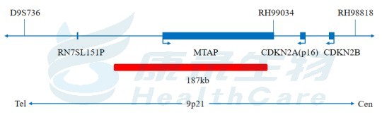 甲硫腺苷磷酸化酶(MTAP)基因位于9p21,该基因在多种上皮及非上皮癌细胞中经常与CDKN2A同时缺失。 MTAP与甲硫氨酸循环相关,是腺嘌呤生成的唯一途径,MTAP缺乏可增强基于嘧啶的化疗药物(如5-氟尿嘧啶[5-FU])在多种癌细胞系中的疗效。