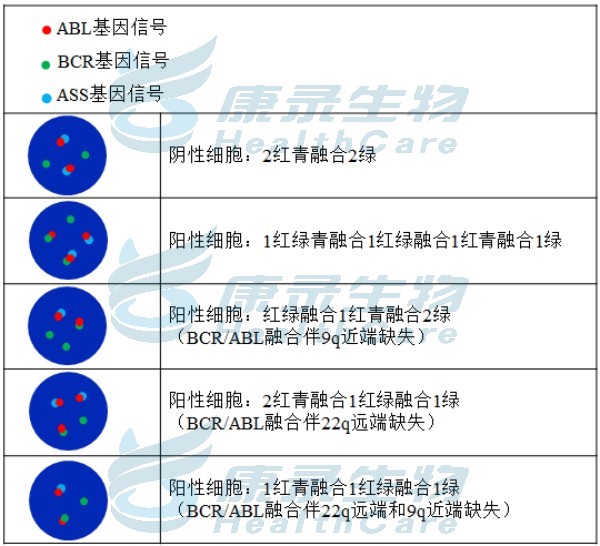 ABL橘红色探针;BCR绿色探针;ASS青色探针。