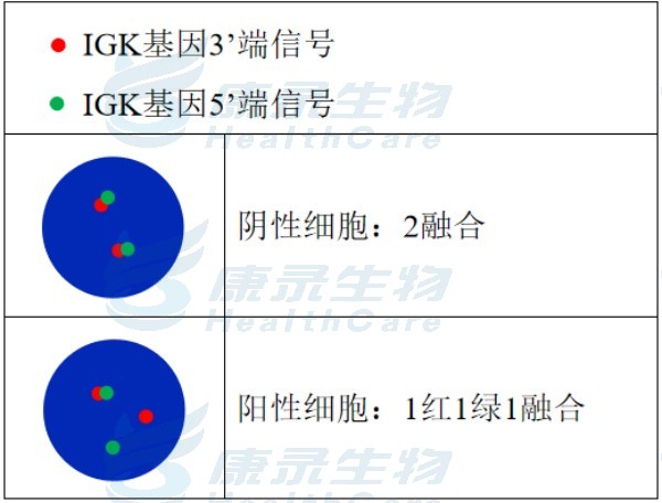 分子遗传学特点为MYC基因与IGH或IGK或IGL发生融合,此断裂探针用于判断是否发生IGK断裂